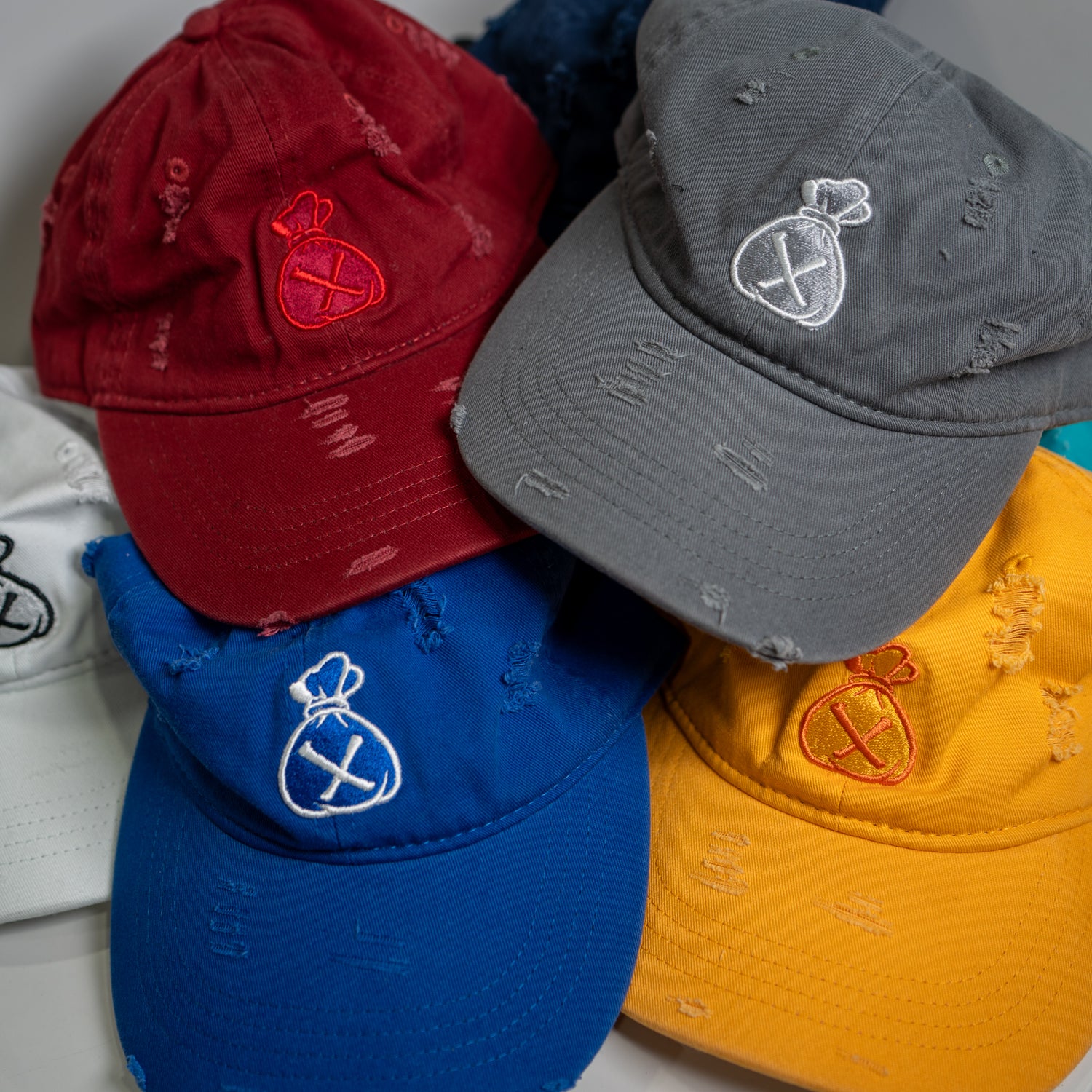 Crafted from 100% cotton, the Money Bag Distressed Strapback Hat combines comfort with a vintage aesthetic.